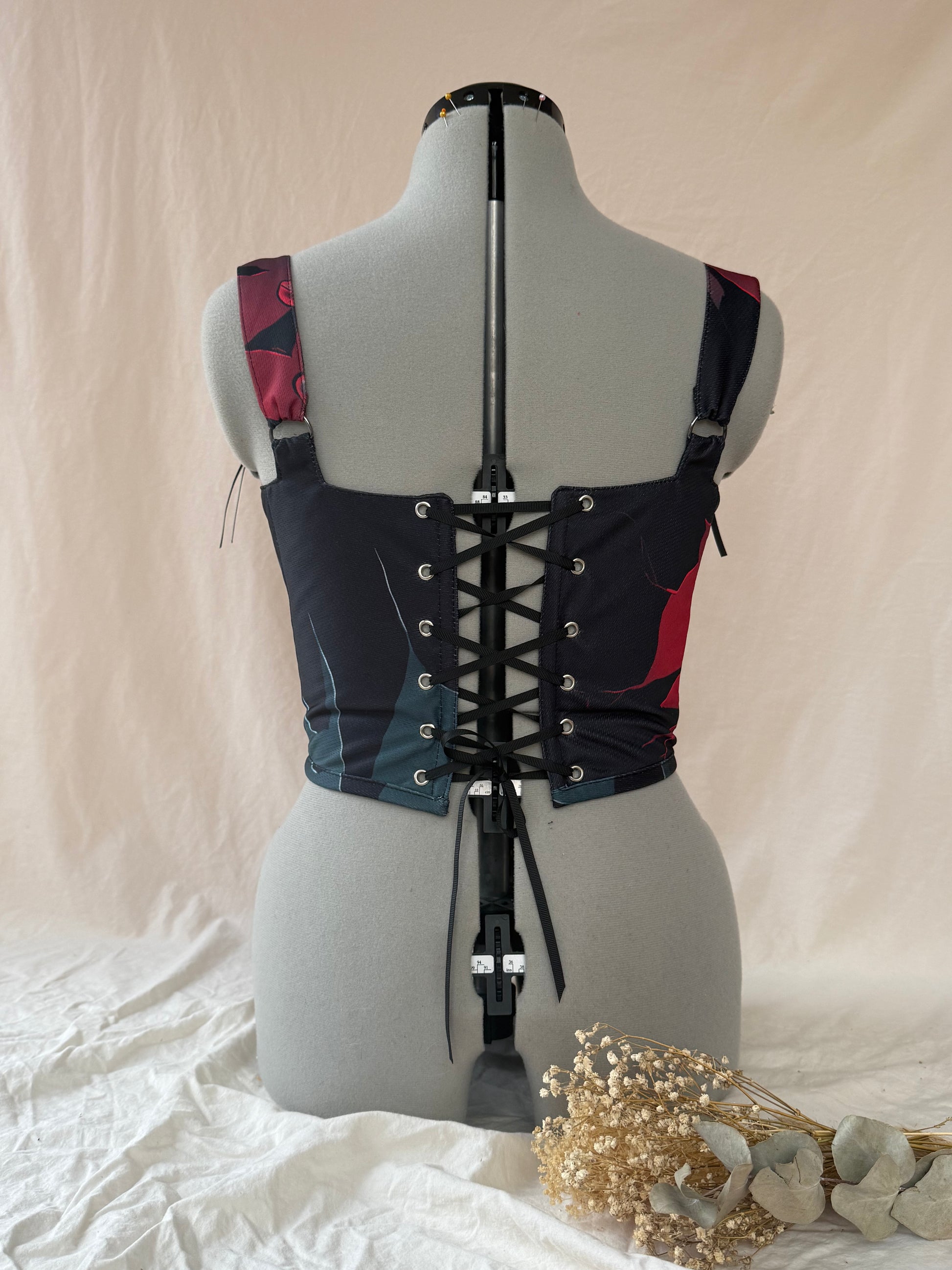 Jason/ Friday the 13th reworked cropped back lacing corset, handmade from a preloved shirt. Created with adjustable lace straps, and boning for extra support. All lining used in our corsets are made from pre loved curtains or 100 percent natural calico. We add interfacing to all our corsets for longevity.