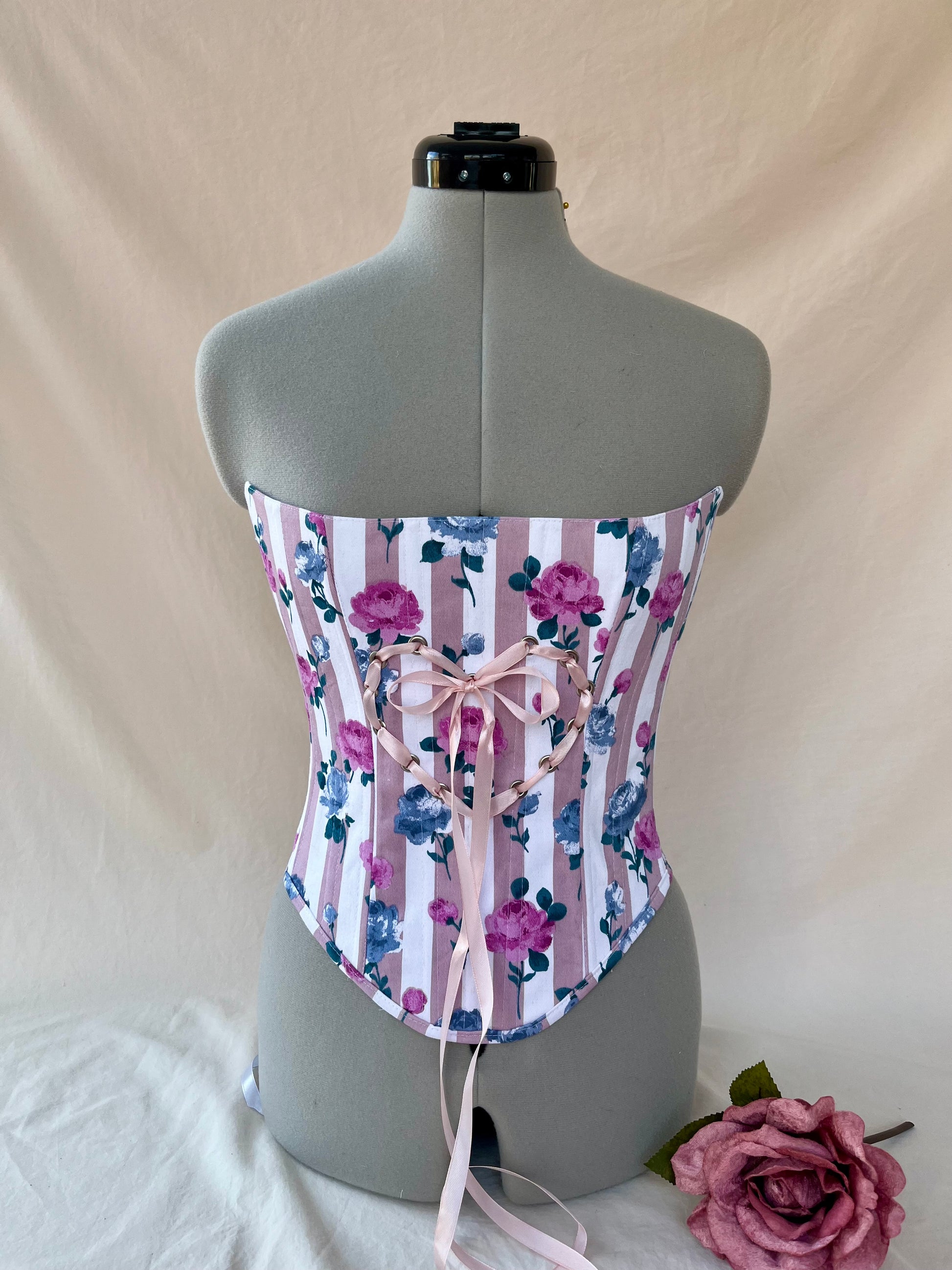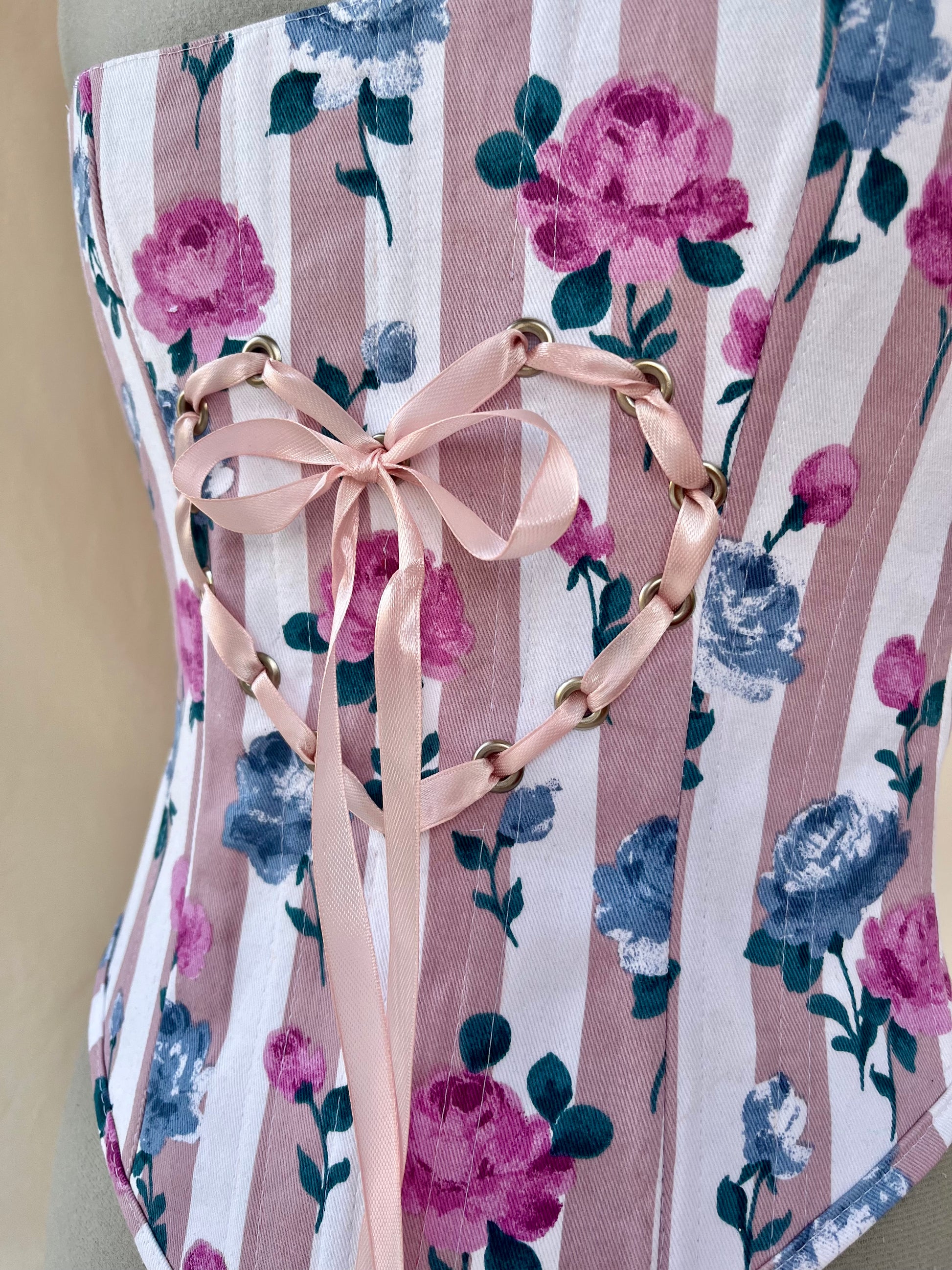 Floral heart back lacing corset, handmade from preloved materials. Created with a strapless neckline and boning for extra support. All lining used in our corsets are made from pre loved curtains or 100 percent cotton. We add interfacing to all our corsets for longevity. This corset sits just below the waist.