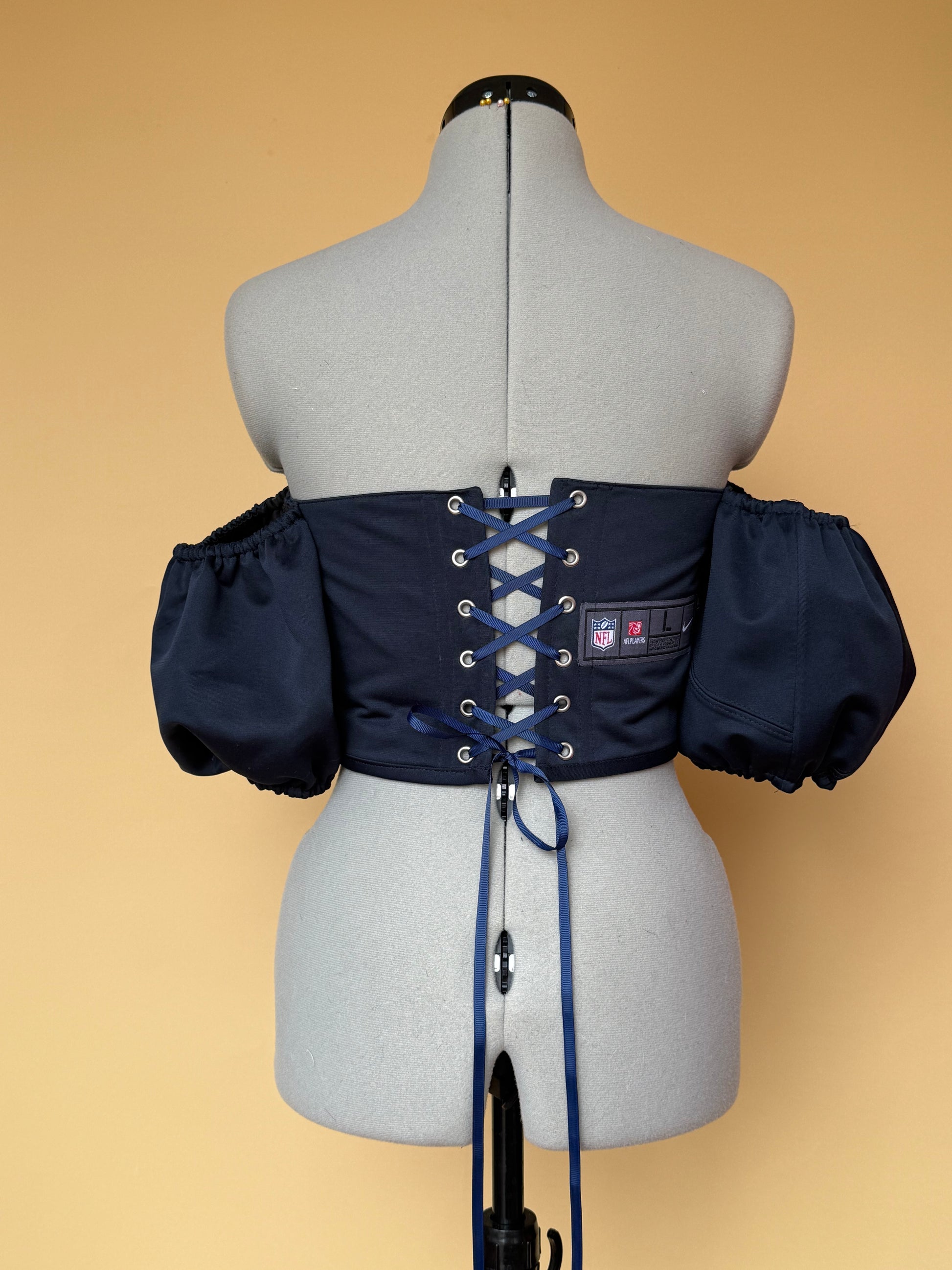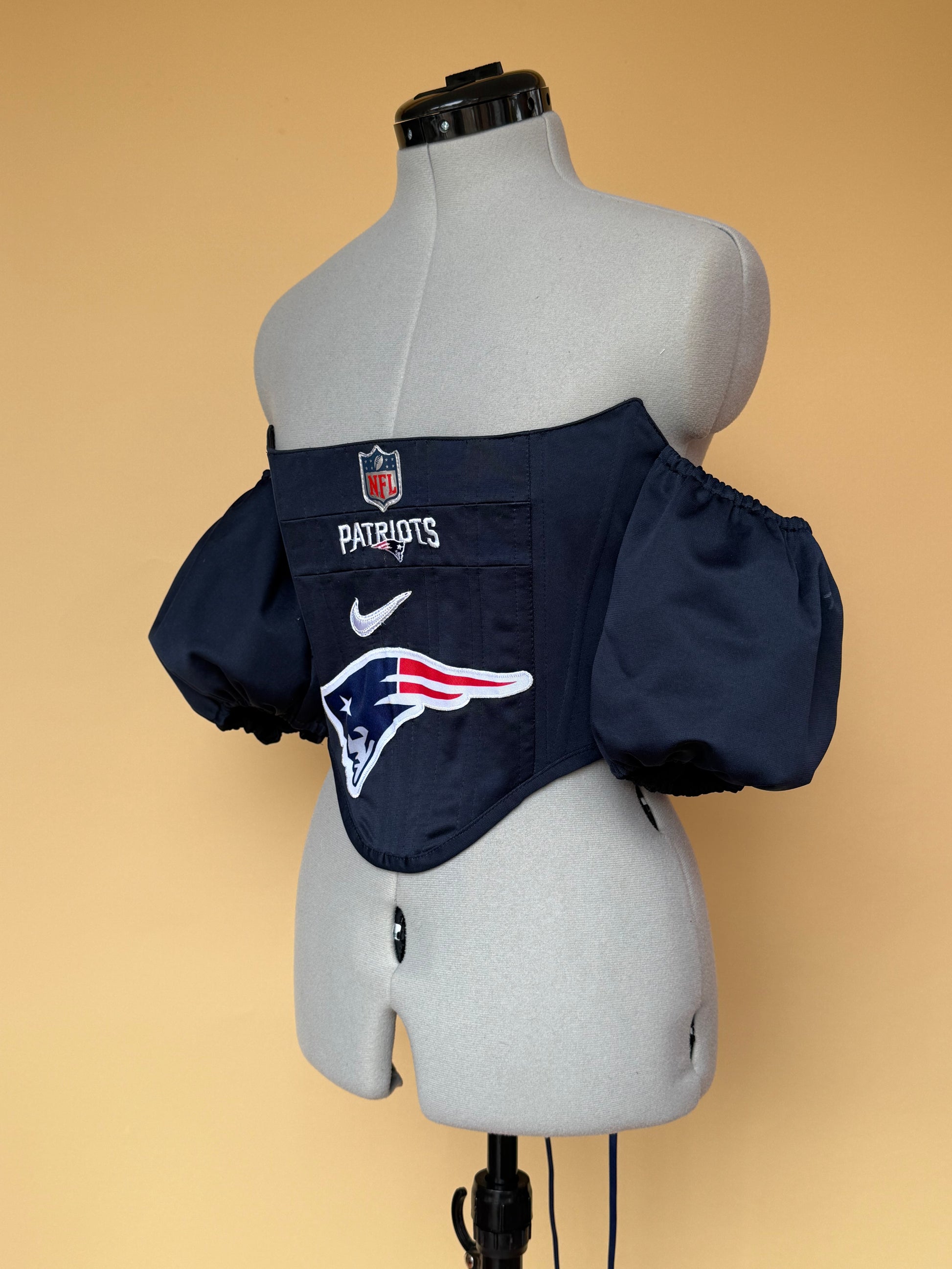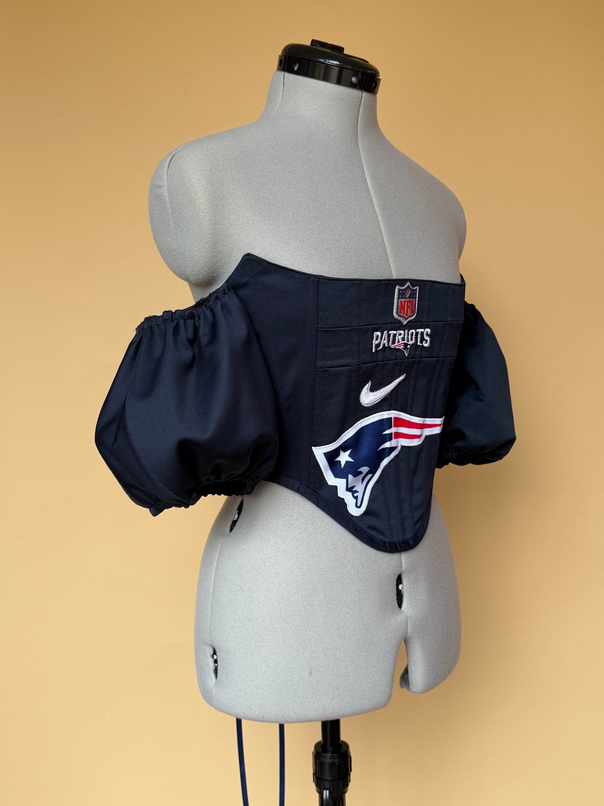 Patriots reworked cropped back lacing corset, handmade from a preloved vintage team Jersey. Created with a strapless neckline, puff sleeves and boning for extra support. All lining used in our corsets are made from pre loved curtains or 100 percent cotton. We add interfacing to all our corsets for longevity.
