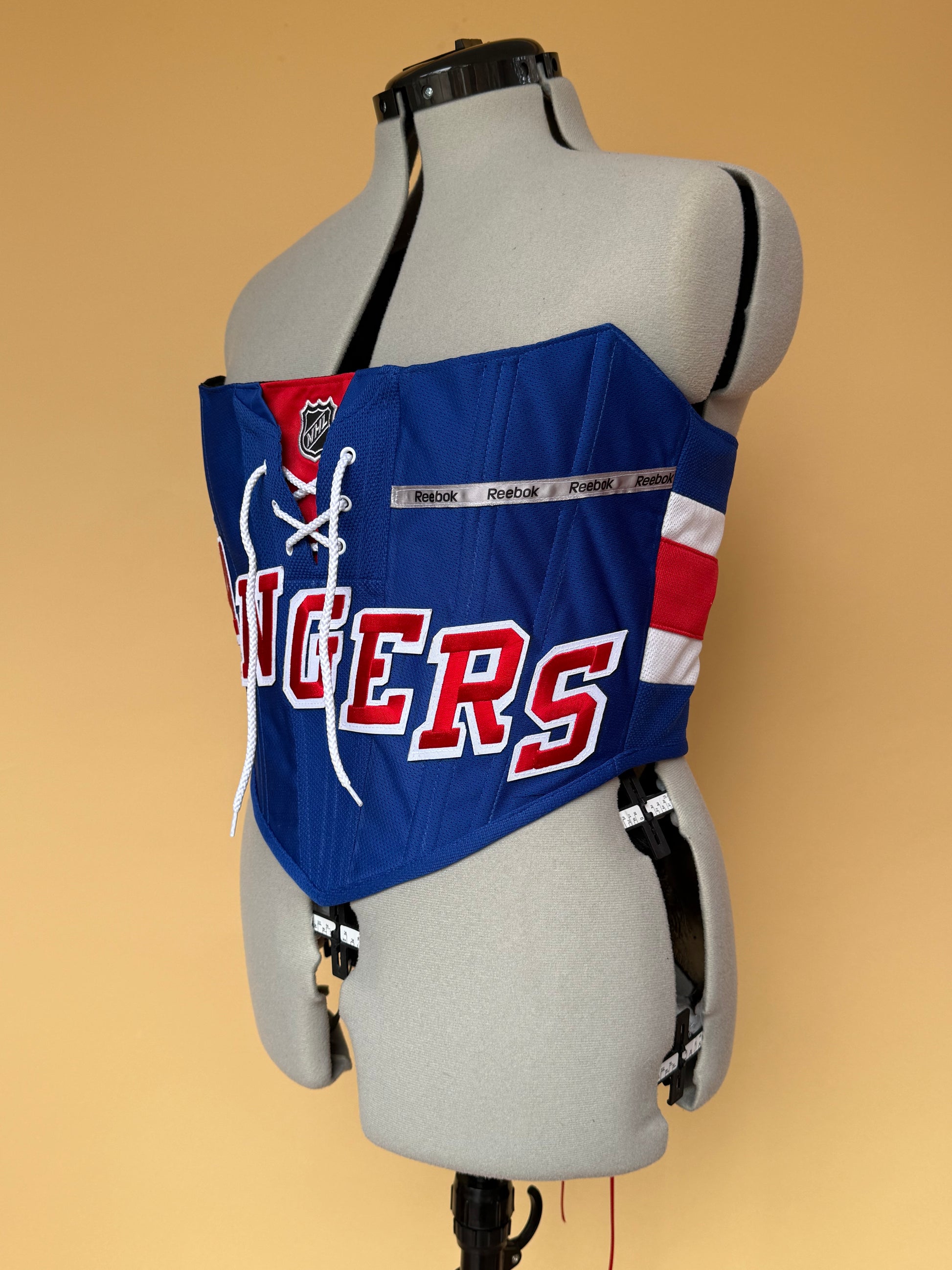 Rangers reworked cropped back lacing corset, handmade from a preloved vintage team Jersey. Created with a strapless neckline and boning for extra support. All lining used in our corsets are made from pre loved curtains or 100 percent cotton. We add interfacing to all our corsets for longevity.